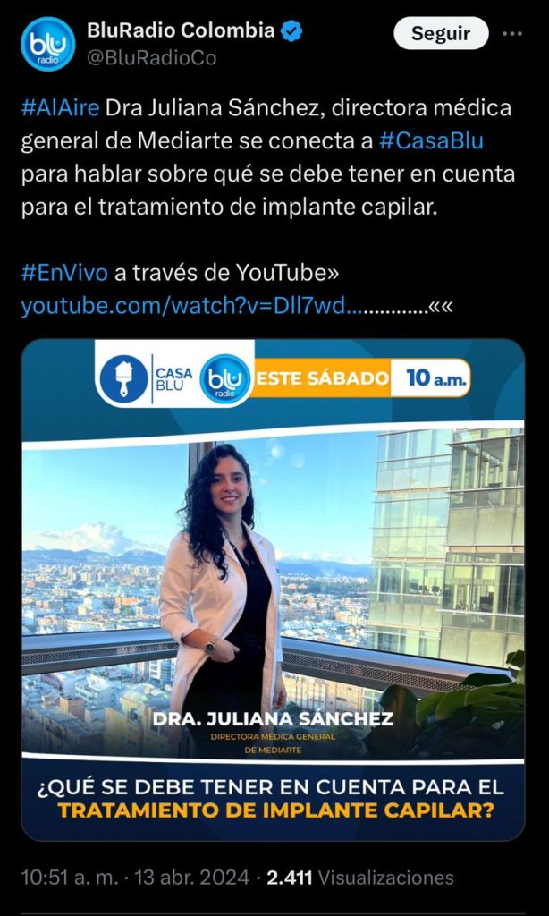 La Dra. Juliana Sánchez Rodríguez es una destacada especialista en trasplante capilar, teniendo nueve años de experiencia en el campo de la restauración capilar. Desde 2015 ha realizado procedimientos utilizando tanto la técnica de extracción de unidades foliculares (FUE) como la técnica de tira (FUSS), consolidando su experiencia en trasplante de cabello, barba y cejas.
